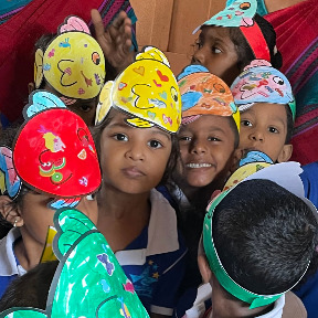 Each gift includes : Glue, paints, scissors, crayons, sharpeners, crepe paper, gems. The children's' faces light up when they are offered gems to do their sticking activities.