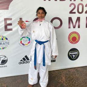 This is Sauya, she took part in the India International Karate Championships 2023 representing Sri Lanka. They were held in New Delhi and she successfully won a bronze medal.